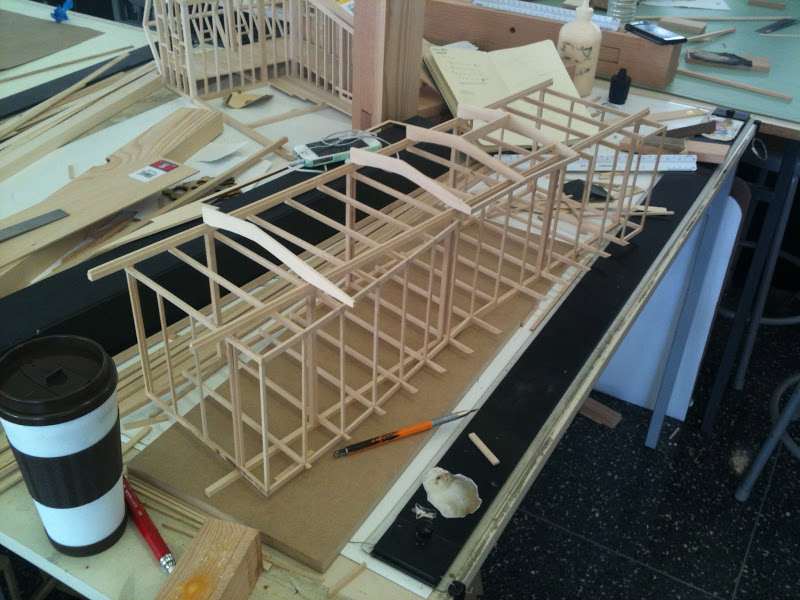 The Projected started the Monday that the photos above were taken. We, all very tired, were handed a list of five different buildings in the world that contained a light timber framing system. From the list, my two partners and myself picked Plywood House by Herzog and DeMeuron. The assignment called for us to, with limited resources, figure out the structure of the building and produce a 1/2"=1' section cut model of the building, along with a site model and a parti diagram.